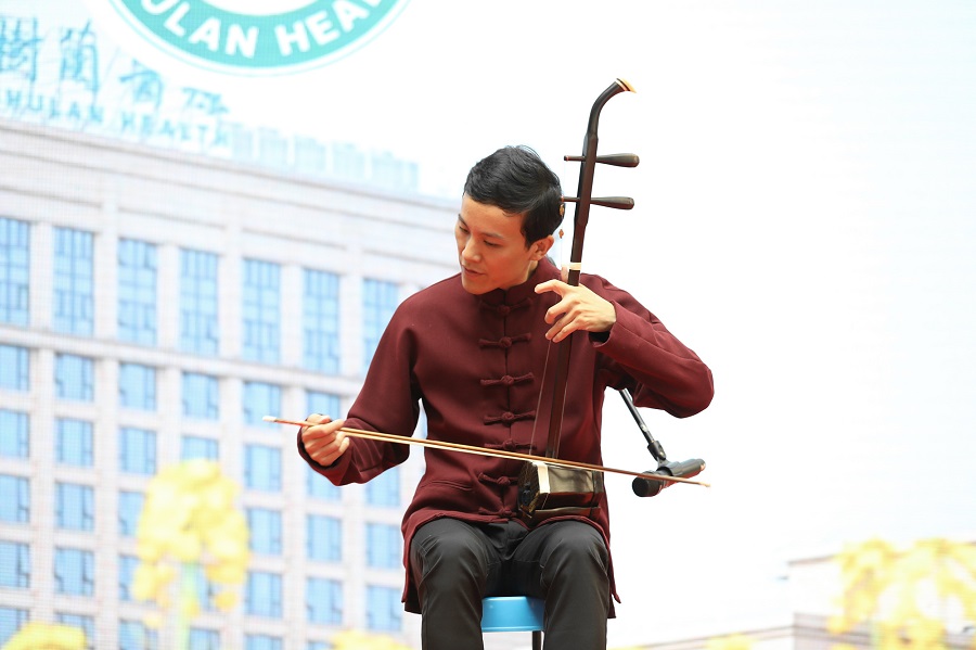 (罗斌在肝友会现场表演二胡)