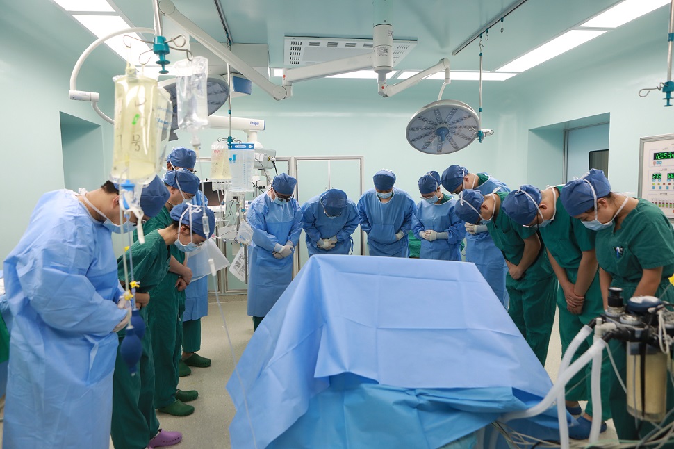 手术进行前,手术主刀医生张武与全体医护人员站在手术台前,面对捐献者默哀,致敬姚先生及家人做出的伟大决定。