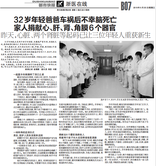 32 岁的姚先生是两个孩子的爸爸,他遭遇严重车祸,经抢救无 效,最终被判定脑死亡,年轻的生命至此戛然而止。 家人悲痛之余,决定捐出他的心脏、肝脏、肾脏、眼角膜6个器官。挽救更多生命的同时,也让他的生命得到延续。