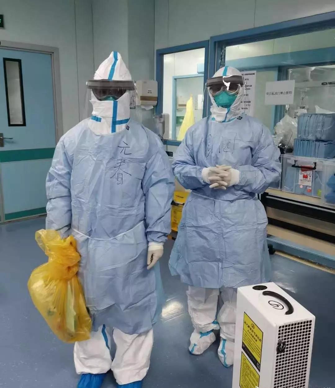 身穿防护服准备进入重症监护室的刘元春(左一)和张园园(右一)