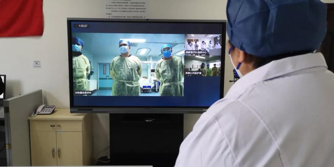 李兰娟院士在湖北省人民医院国家医疗队指挥室视频会诊,了解病情,制定治疗方案。